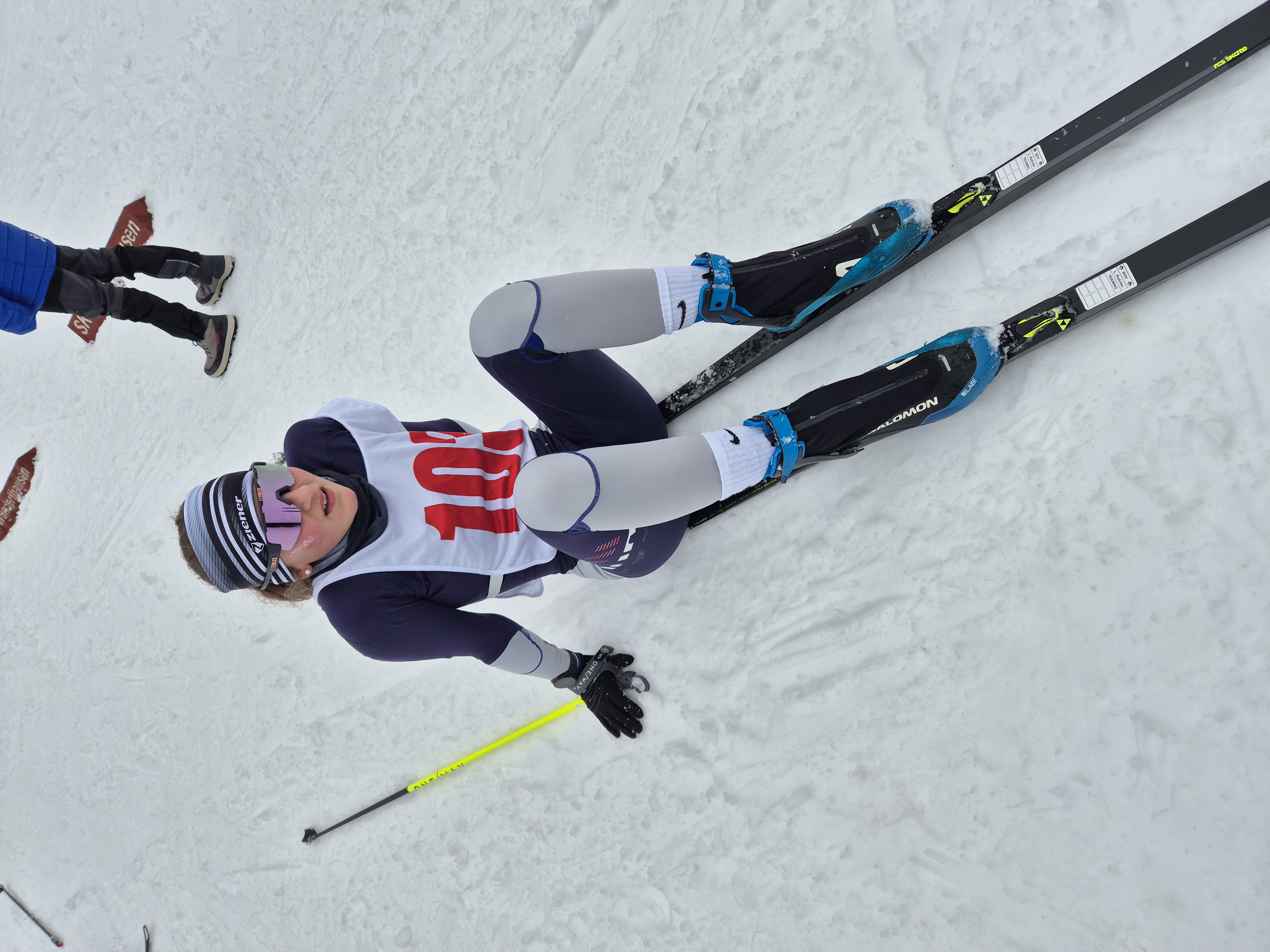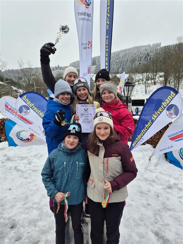 Die ersten Zieleinläufe machten bereits Hoffnung auf einen Sieg unserer Schule, da durch die engagierte Laufleistung einige Gegnerinnen und Gegner überholt wurden und dadurch im Ziel erst einmal vor Erschöpfung nichts mehr ging. Insgesamt waren alle zufrieden mit ihren Leistungen und nun begann das lange Warten auf die Ergebnisse. Kurz vor der Verkündung der Siegerinnen und Sieger gab es jedoch noch einen Schockmoment, als klar wurde, dass einige Athletinnen und Athleten unserer Schule beim Slalomhindernis Strafsekunden kassiert hatten, doch selbst das konnte der starken Leistung nichts anhaben. Am Ende siegten beide Mannschaften souverän, die Jungenmannschaft sogar mit der Bestzeit im Vergleich der Länder NRW und Hessen. Wir gratulieren unseren Skilangläuferinnen und -langläufern zum Einzug ins Bundesfinale in Schonach!