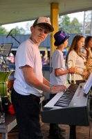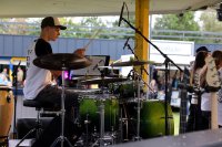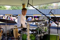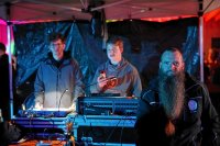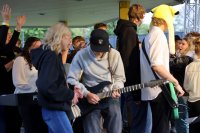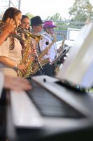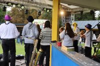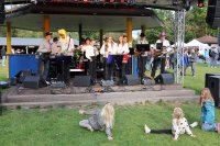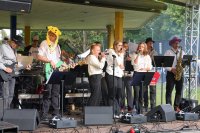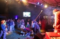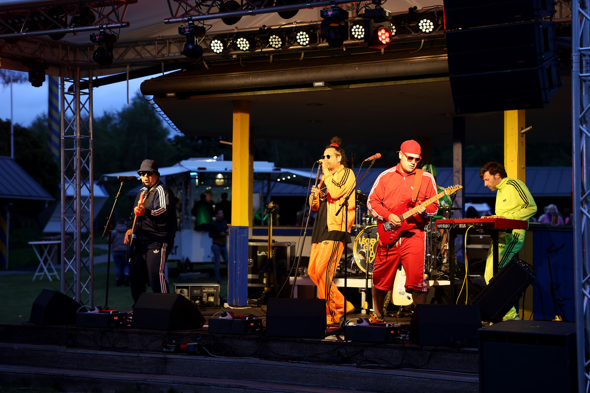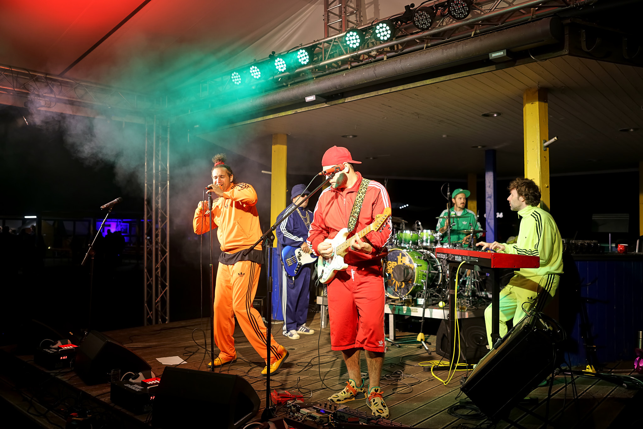 Trainingsanzüge in allen Farben sind das Markenzeichen von „The Legendary Ghetto Dance Band“, die dem Regen zum Trotz eine spektakuläre Show ablieferte und mit einer Mischung aus HipHop, Dancehall und Rock der 90er und 2000er das Publikum zum Tanzen brachte.