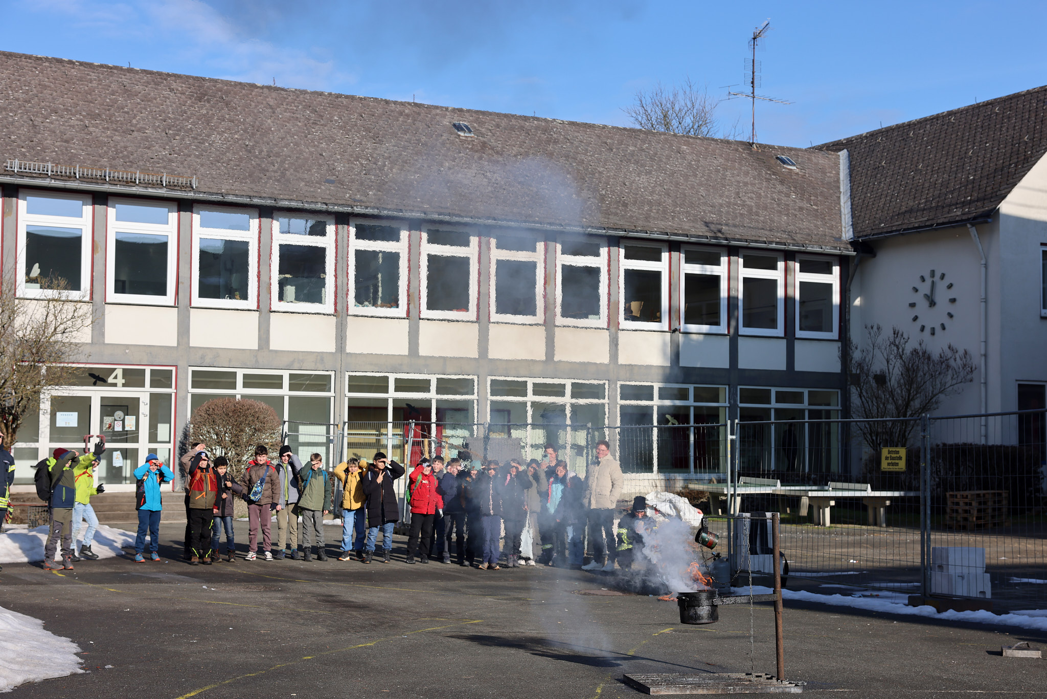 Spektakulär ging es im Projekt der Feuerwehr zu: Mit einer riesigen Fettexplosion demonstrierten die freiwilligen Feuerwehrleute den beeindruckten Fünftklässlern und -klässlerinnen, dass nicht jedes Feuer mit Wasser gelöscht werden kann.