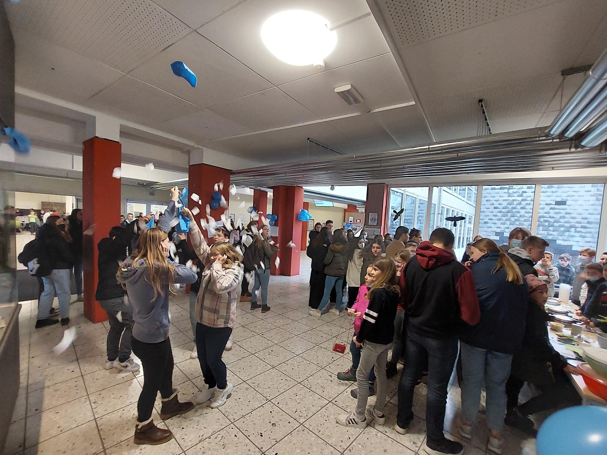 Anlässlich des jährlichen internationalen Tages der Kinderrechte haben die Schülerinnen und Schüler der Jahrgangsstufe 7 des Johannes-Althusius-Gymnasiums einige Aktionen auf die Beine gestellt! Am 23.11.2022 wurden alle JAGler durch blaue Luftballons, blaue Steine und kreativ gestaltete Schilder schon von Beginn des Tages an auf die Kinderrechte aufmerksam gemacht – bei der Farbe Blau wird die Farbe von UNICEF aufgegriffen, die den Tag unterstützen.