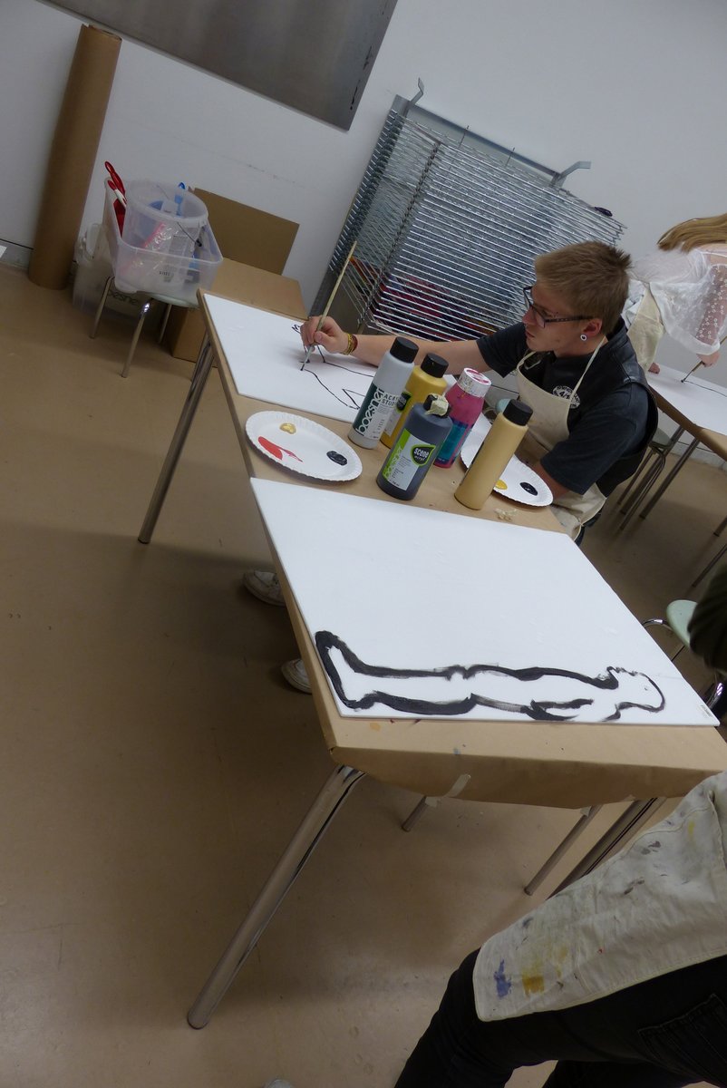 Nach einer Führung der beiden Kurse, durfte dann selbst wie bei Baselitz mit breitem Pinsel Hand angelegt und eigene Helden kreiert werden. Erstaunlich, was da manch SchülerIn in einer knappen Stunde auf Leinwände zauberte. Wer neugierig ist, sieht zwei der Helden in den Vitrinen vor dem Kunstraum. Welche künstlerischen Anstöße dieser Besuch noch mit sich gebracht hat, sieht man dann hoffentlich auch bald …