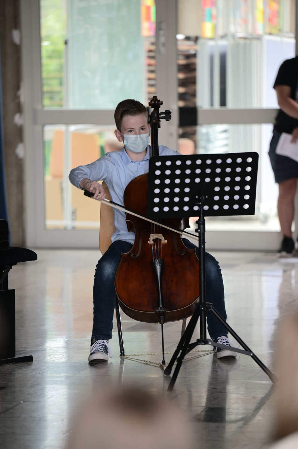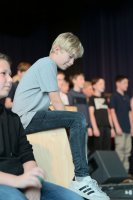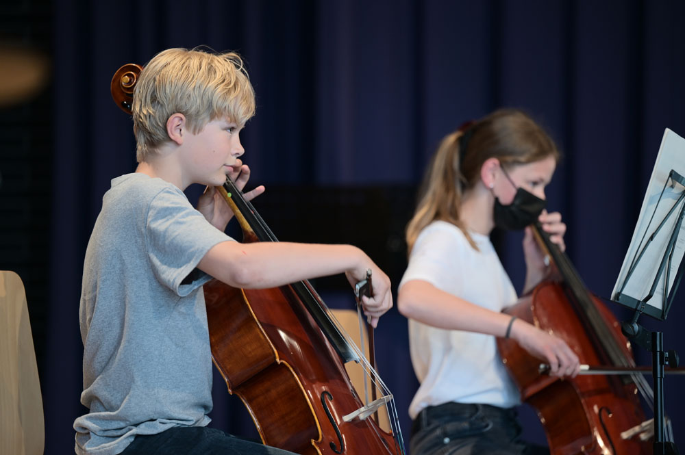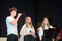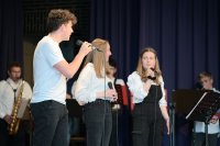 Mit einem Feuerwerk aus Energie, Rhythmus und Gesang riss die Klasse 6a das Publikum vom ersten Moment an mit, als hätte sie zwei Jahre lang auf genau diesen Augenblick gewartet. Entsprechend der Idee, den Fokus der diesjährigen Ausgabe von JAG in Concert auf die Unterstufe zu legen, also auf diejenigen, die coronabedingt bisher nicht die Möglichkeit hatten, musikalisch in Erscheinung zu treten, standen am Freitag Abend fast sämtliche Fünft- und SechstklässlerInnen auf der Bühne. In nur kurzer Zeit hatten sie ein vielfältiges und abwechslungsreiches Programm erarbeitet, das durch die Beiträge des Musikprojekts und herausragende Solo-Auftritte bereichert wurde. So überraschte der Jugend musiziert - Preisträger Joel Renfordt (7a) mit seiner technisch wie musikalisch völlig souveränen Interpretation von David Poppers Gavotte. Emotionale Höhepunkte waren sicherlich der sensible pianistische Vortrag von “Two Trees” von Chiara Hoffmann sowie “My way” von Frank Sinatra - dargeboten vom Moderator des Abends höchst persönlich - Julius Janetzki. Ebenso vermochten die SängerInnen der Schulband Danielle Paysan, Cathi Schäfer und Jakob Lach, das Publikum mit Ihrer Interpretation von Sarah Connors “Ruiniert” zu berühren. Mit einem kreativen körperbetonten Bühnenauftritt sowie samtig-weichen Bläserklängen rundete die Schulband den Abend ab.