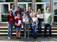 Einen dritten Preis erzielten Paul Weller (Klasse 6), Florian Paesler (Klasse 7) sowie Frieda Möldner und Latoja Lamp (beide Klasse 8). Gleich vier Schülerinnen und Schüler schafften sogar einen ersten Preis. Hierzu konnte der Vorsitzende der Fachschaft Mathematik Thorsten Mankel Paul Reinhard (Klasse 6), Jakob Reinhard (Klasse 9), Leonie Nordmann (Jahrgangsstufe 10) und Bijan Kavousian (Jahrgangsstufe 11) gratulieren und die Gewinne in Form von interessanten Gesellschaftsspielen überreichen.