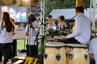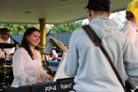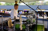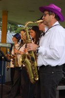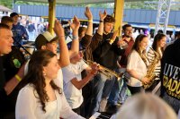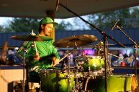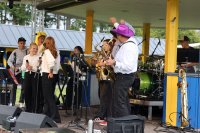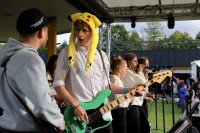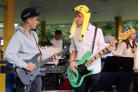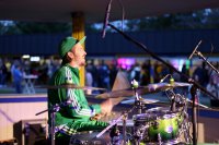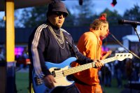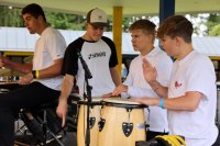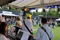 Trainingsanzüge in allen Farben sind das Markenzeichen von „The Legendary Ghetto Dance Band“, die dem Regen zum Trotz eine spektakuläre Show ablieferte und mit einer Mischung aus HipHop, Dancehall und Rock der 90er und 2000er das Publikum zum Tanzen brachte.