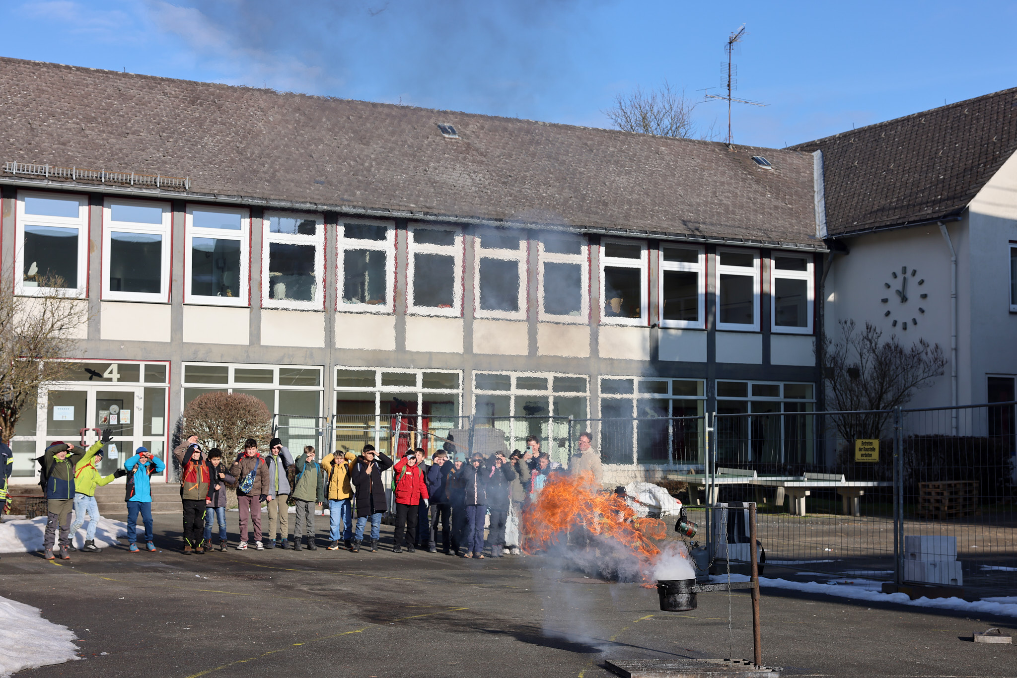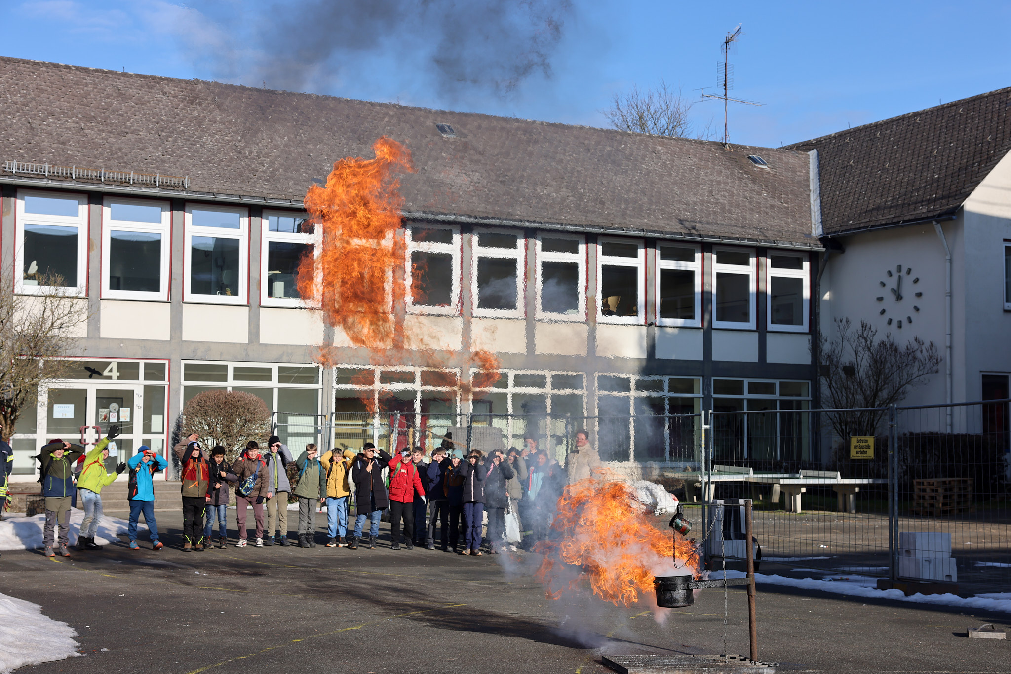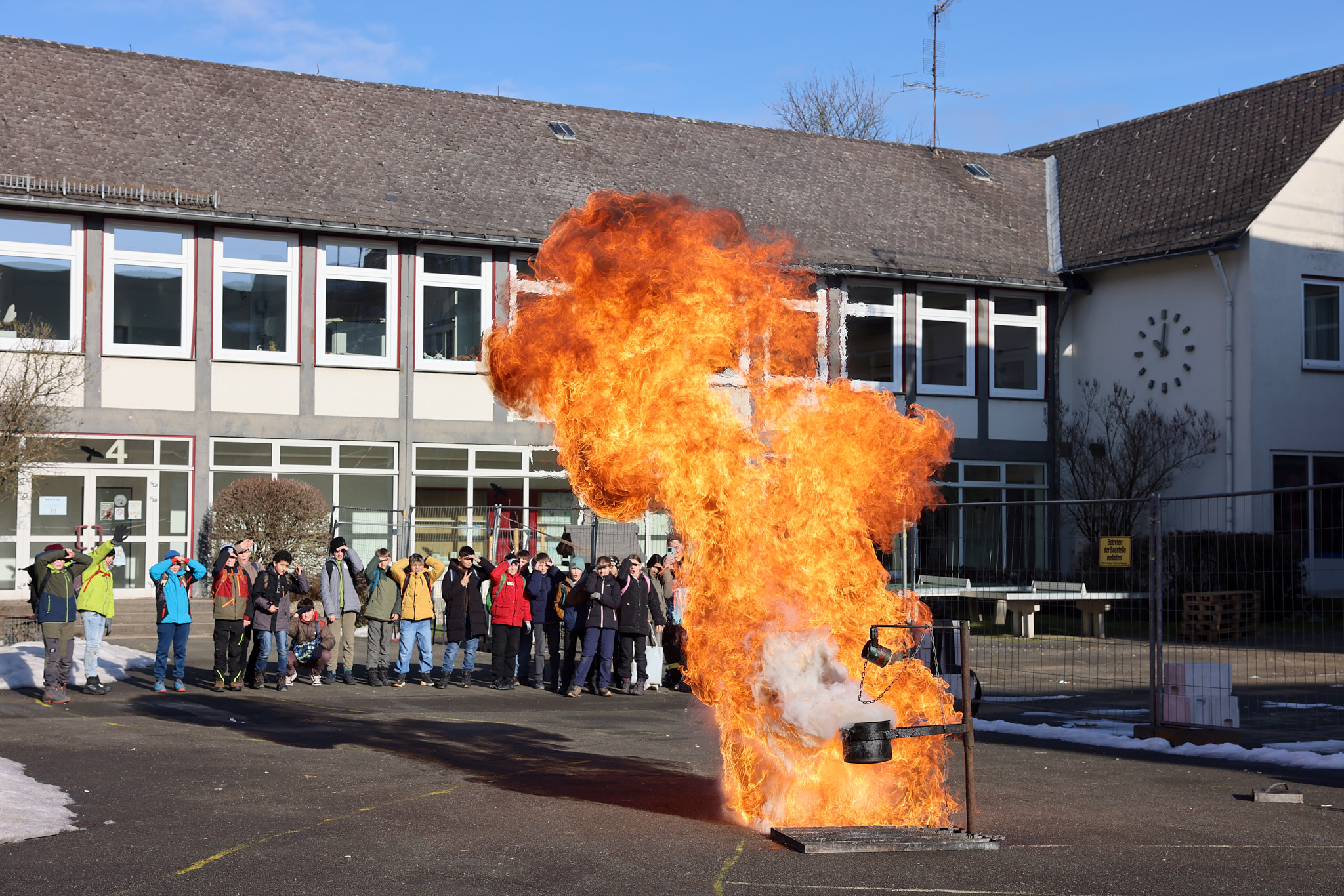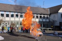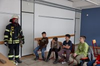 Spektakulär ging es im Projekt der Feuerwehr zu: Mit einer riesigen Fettexplosion demonstrierten die freiwilligen Feuerwehrleute den beeindruckten Fünftklässlern und -klässlerinnen, dass nicht jedes Feuer mit Wasser gelöscht werden kann.