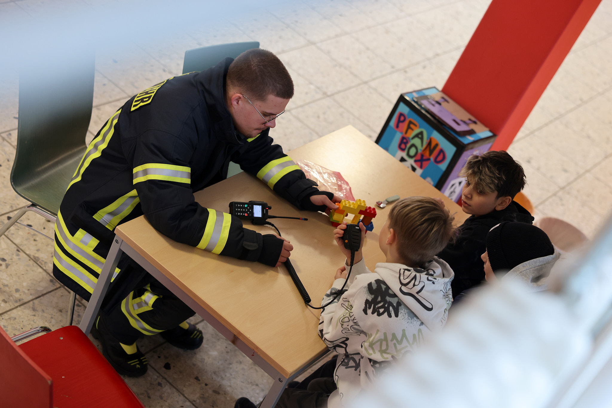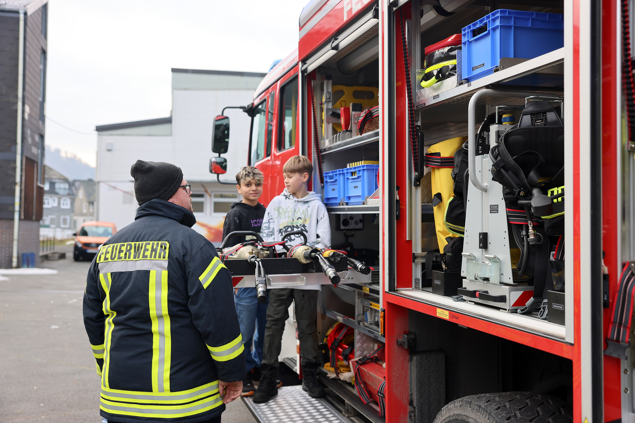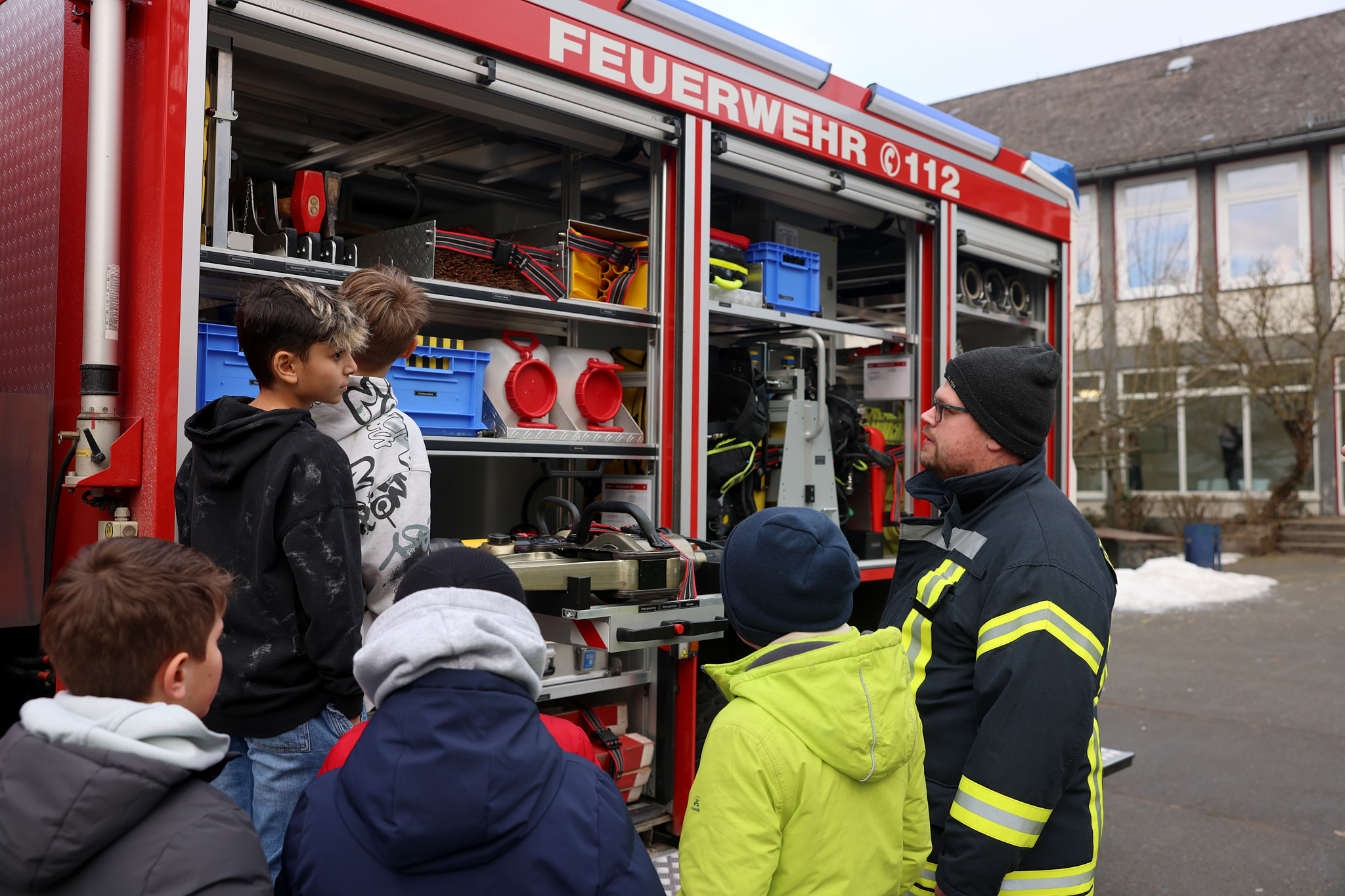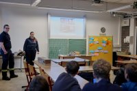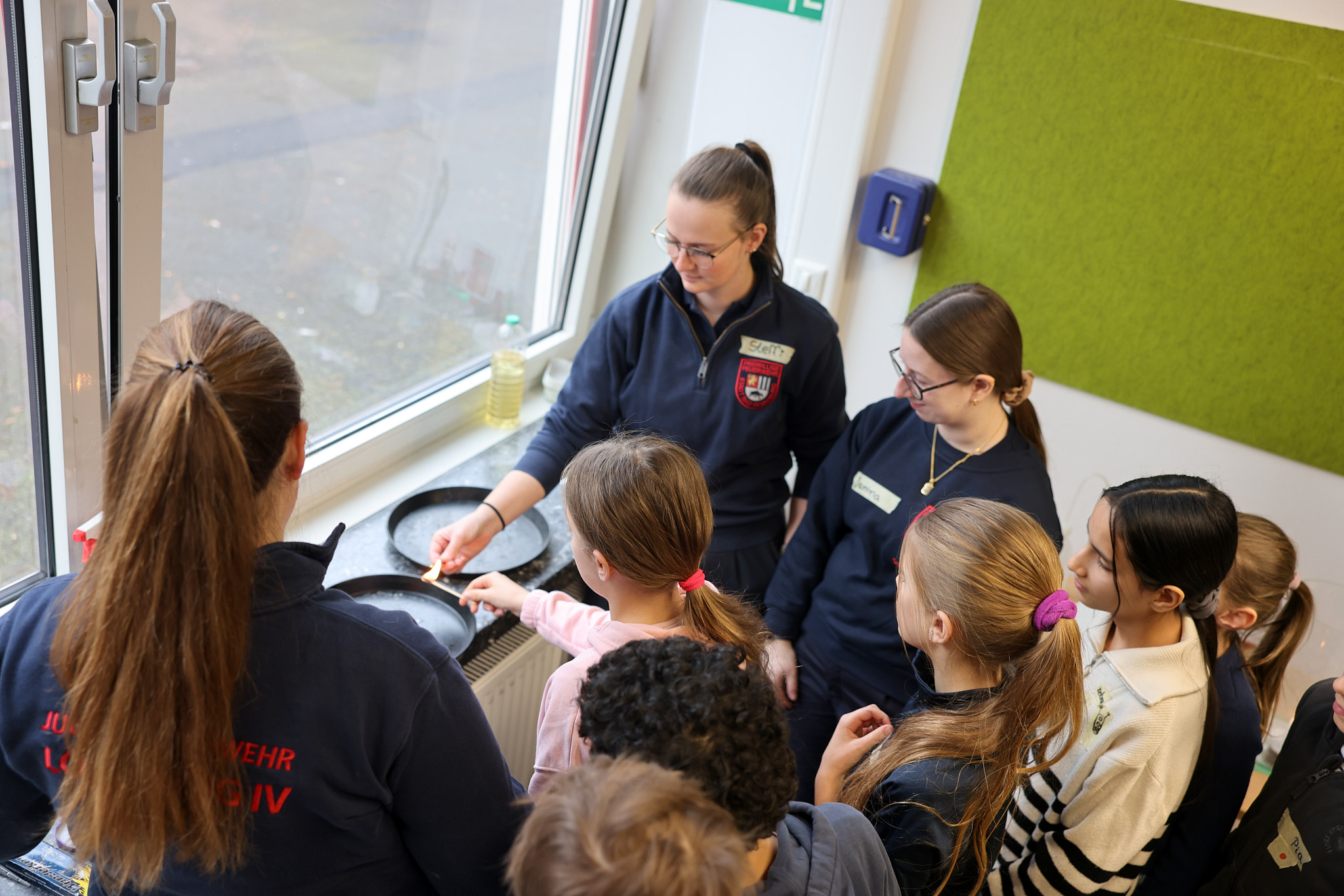 Spektakulär ging es im Projekt der Feuerwehr zu: Mit einer riesigen Fettexplosion demonstrierten die freiwilligen Feuerwehrleute den beeindruckten Fünftklässlern und -klässlerinnen, dass nicht jedes Feuer mit Wasser gelöscht werden kann.